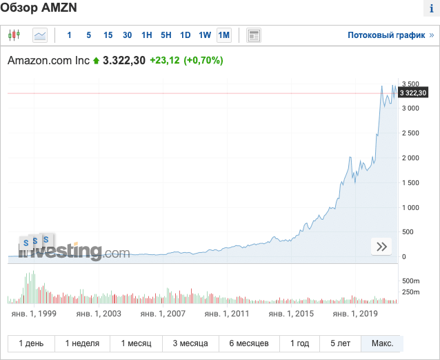 Десять лет назад уже было понятно, что самый большой книжный магазин в мире будет развивать себя как онлайн-ретейлер. После тщетных попыток обойти крупнейший магазин обуви zappos.com на рынке, Amazon купил его, заплатив $ 1,2 млрд. И это был уже 2009 год. И те, кто уже это понимал, купили акции компании еще по $ 150. Сейчас это $ 3300 – рост в 22 раза… Что будет с $ AMZN еще через десять лет? Безусловно, только рост!