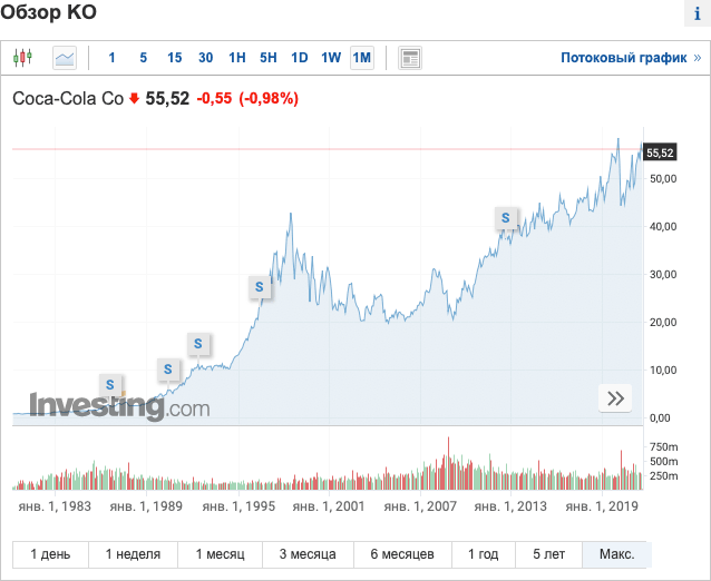 Этот бренд знают во всем мире. Каждый человек с детства узнает этот логотип. Смотрим на рост цены: $ 25 десять лет назад и $ 55 сейчас – рост в два раза. То есть, по сути, самая консервативная компания, которая стабильно и спокойно платит дивиденды, и то выросла в два раза за последние десять лет.