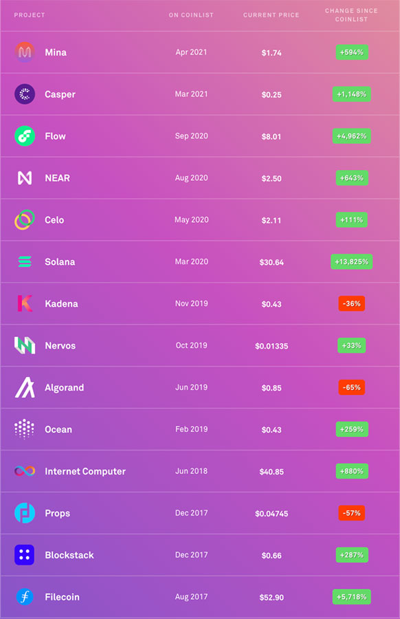 На заглавной странице сайта вы можете увидеть, как выросли или упали те или токены, которые выходили через COINLIST.