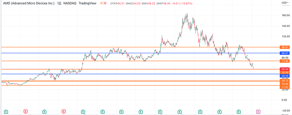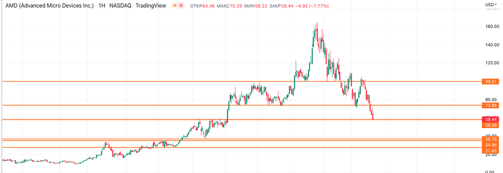 Вторая покупка возможна на уровне 49,09, но так как синяя линия относится к дневному ТФ, то этот уровень может быть пробит, поскольку более слабый, нежели уровни с недельного ТФ. В данной ситуации можно взять по 49,09, надеясь, что на этом уровне будет разворот и цена пойдёт выше. Либо пропустить и ожидать более глубокого падения до 36.75–34.86 и уже на этих ценах докупать АМД.