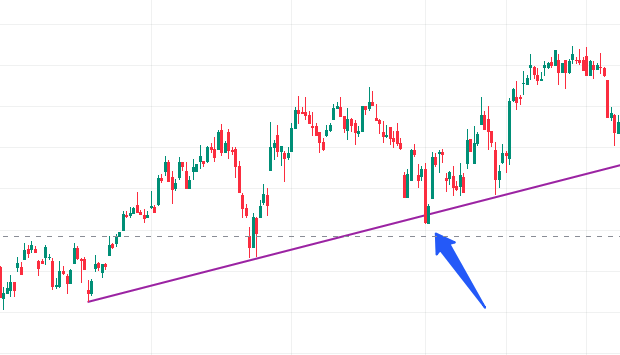 Синей стрелкой показал пример. Такой «прокол» называется ложный пробой. То есть тело не ушло ниже линии, а цена вернулась выше трендовой линии.