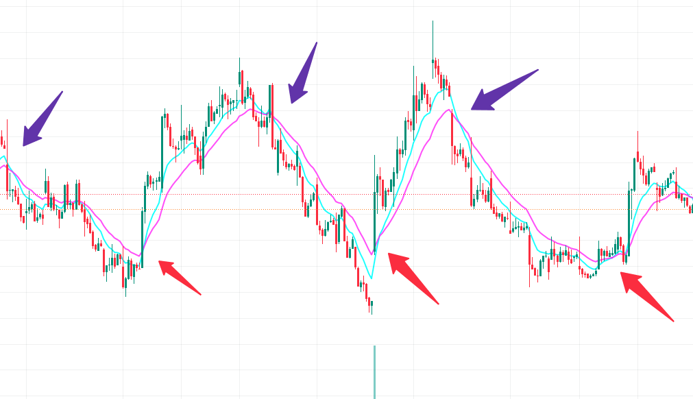 На графике выше вы видите фиолетовые стрелки, где на пересечении СС 10 и 20 можно было открывать шорт и на красной стрелке либо закрывать его, либо открывать лонг и на фиолетовой его закрывать. В данном примере ТФ 1 час.