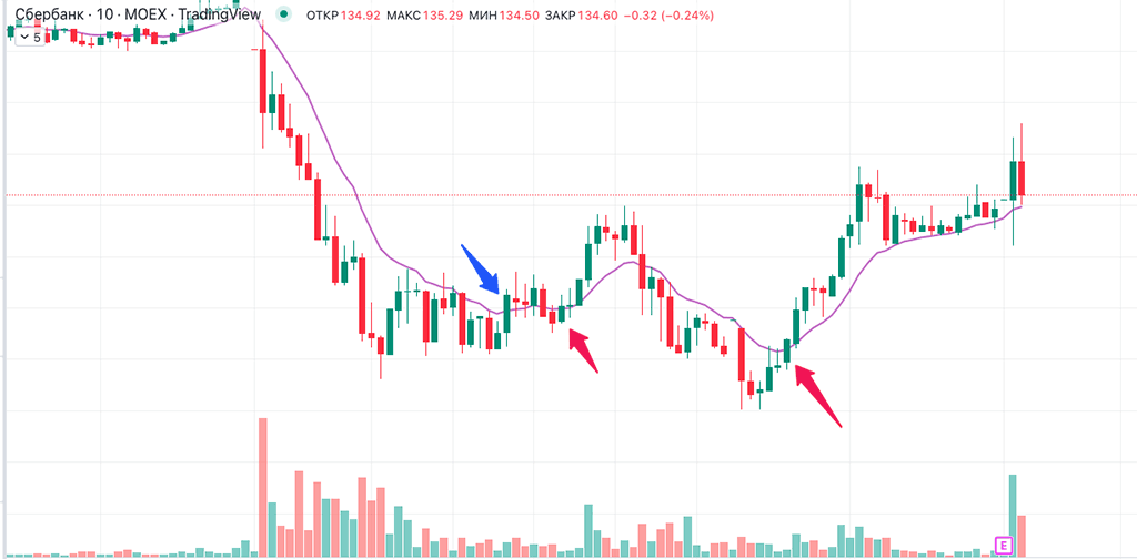 Свечи “пересекают” скользящую среднюю – это может говорить о предстоящей смене тренда.