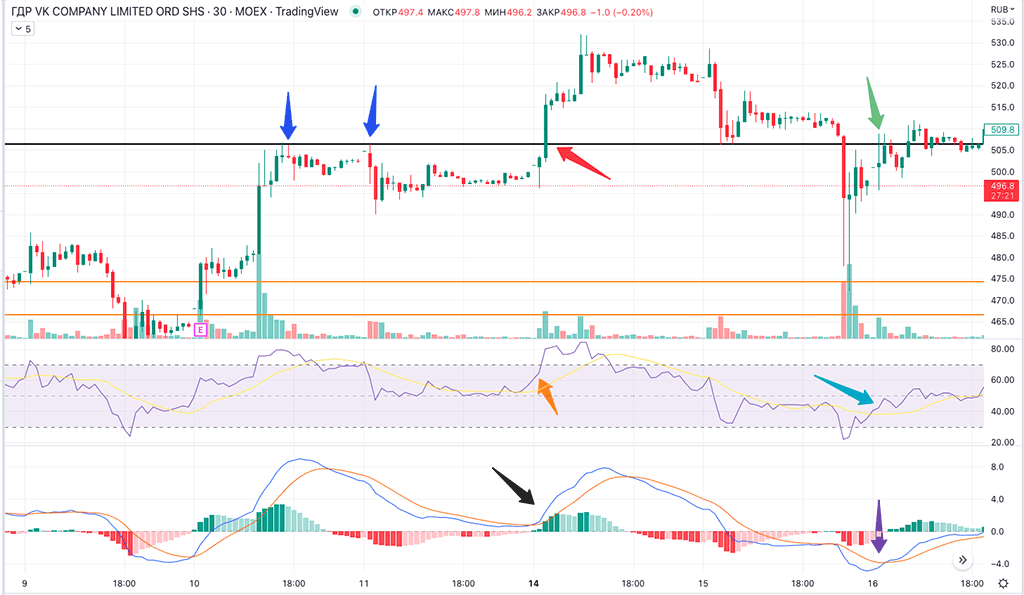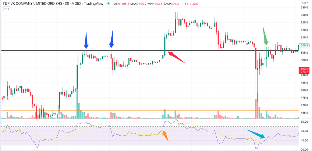 Чуть позже цена уходит ниже 509.8 и через какое-то время снова пробивает сопротивление. Зеленой стрелкой я показал этот момент. Но сделку я не открываю, так как RSI ниже 50 (бирюзовая стрелка). Смысла открывать сделку в тот момент я не вижу.