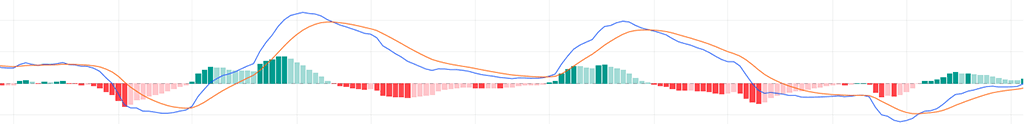 Обратите внимание, как только синяя линия пересекает оранжевую снизу вверх, образуются зеленые столбики. Как только синяя линия пересекает оранжевую сверху вниз, вместо зеленых столбиков появляются красные.
