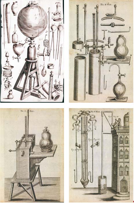Engravings of Boyle’s air pumps. The top left engraving is from the backpiece to New Experiments: Physico-Mechanical, Touching the Spring of the Air, and its Effects, by Robert Boyle, 1660.