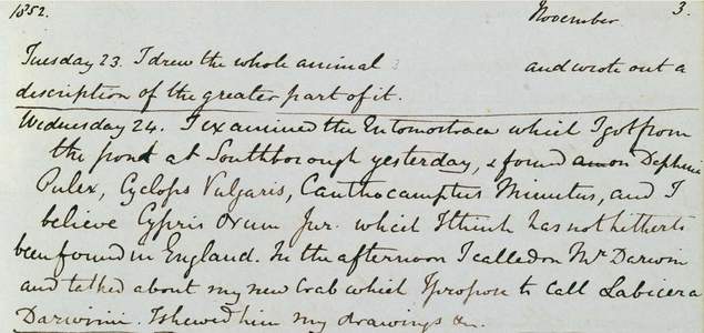 An entry in John Lubbock’s diary describing a crab which he intends to name after Charles Darwin, 24 November 1852.