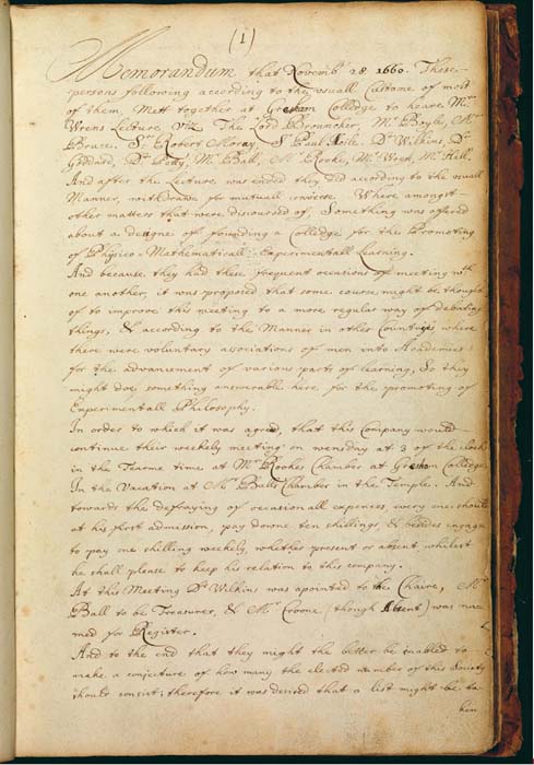 A record of the founding of the Royal Society and the first meeting, 28 November 1660.