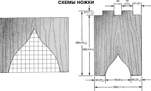 Каждая ножка имеет вырез, образующий как бы две отдельные «ножки». Вы можете увеличить показанный здесь образец или придумать вырез собственной формы. В любом случае сделайте разметку на каждой ножке и сделайте вырезы электролобзиком. Зашлифуйте все видимые следы от пилы и скруглите все острые углы и ребра шкуркой.