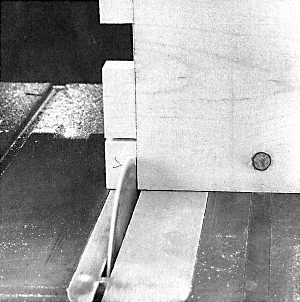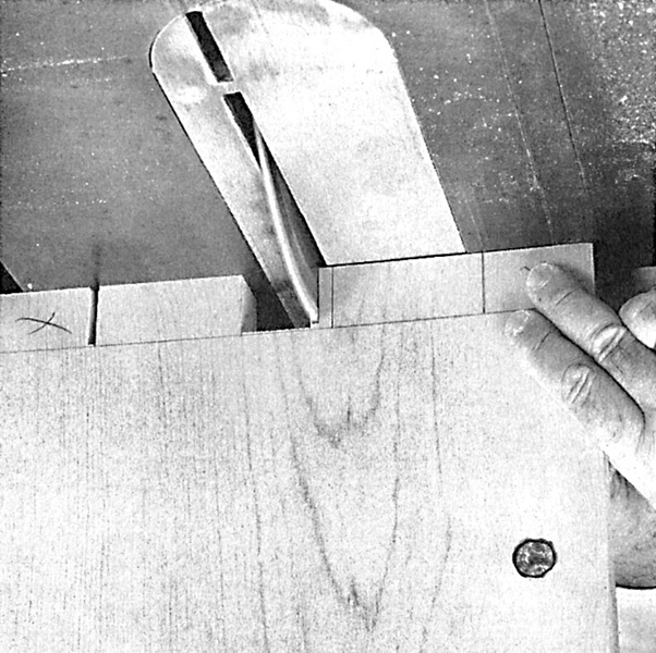 Циркулярка быстро вырезает шипы. Высоту пильного диска установите равную толщине материала. Поставьте ножку на торец и подавайте с помощью углового упора. Сделайте пропилы по обе стороны разметки каждого шипа. Затем выберите отход между двумя шипами дополнительными пропилами.