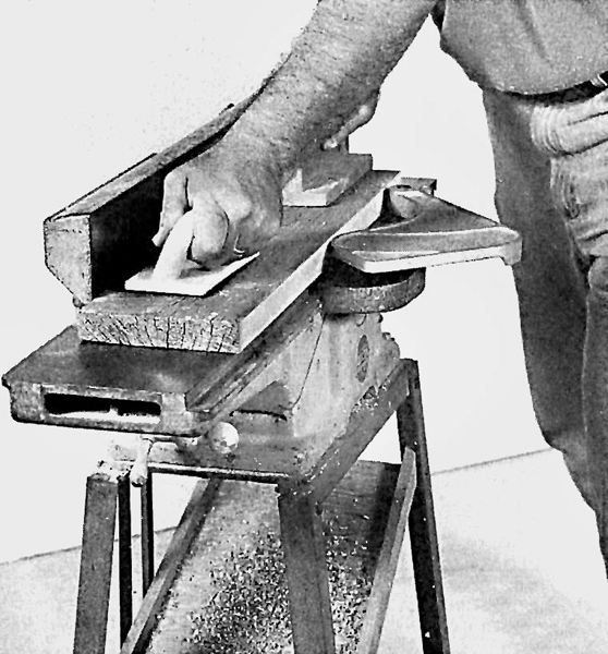 Независимо от природы доски ключ к достижению плоскостности заключается в обеспечении постоянного равномерного нажима вниз на выходящий конец, когда доска минует ножевой вал. Очевидно, что сначала нажим должен осуществляться с подающей стороны. Но после того как ведущий конец доски выдвинется примерно на 30 см (12 дюймов) от ножевого вала, надо перенести левую руку на приемную (выходную) сторону и сконцентрировать нажим там. Если доска не прилегает к приемному столу в каком-то месте, то пока вы еще не получили плоской поверхности.