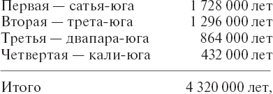 что составляет один божественный век, или махаюгу. Семьдесят одна махаюга составляет 306 720 000 лет, к которым добавляется сандхия (или время, когда день и ночь граничат друг с другом, утренние и вечерние сумерки), равная одной сатья-юге, 1 728 000 лет, что составляет одну манвантару, состоящую из 308 448 000 лет.[155] Четырнадцать манвантар составляют 4 318 272 000 лет, к которым нужно прибавить сандхию, чтобы началась кальпа, 1 728 000 лет, образуя кальпу или великий период, состоящий из 4 320 000 000 лет. Так как мы теперь находимся в кали-юге двадцать восьмого века седьмой манвантары из 308 448 000 лет, то у нас еще достаточно времени впереди, чтобы дождаться даже хотя бы половины того времени, которое отпущено миру.