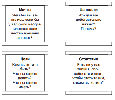 Большинство людей пытаются составлять для себя какие-то планы и терпят в этом неудачу. Очень часто приходится слышать: «Чем тщательнее я что-то планирую, тем больнее для меня последствия различных случайностей. Поэтому я отказался от планов и, таким образом, застраховал себя от разочарований». А ведь причина, почему так многие люди не могут претворить свои планы в жизнь, очень проста. Они забывают увязать между собой свои мечты, цели, внутренние ценности и стратегии.
