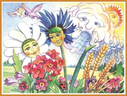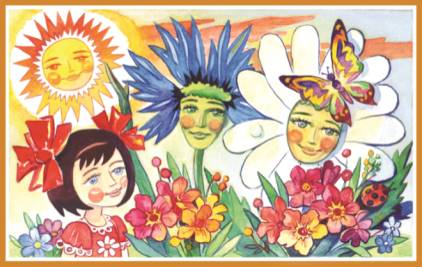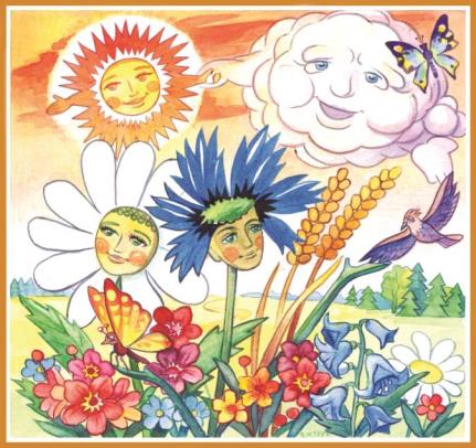 Тёплым днём на небе сияло Солнышко. Оно дотрагивалось до каждой травинки, до каждого цветочка и деревца тёплыми, весёлыми лучами и пело песенку. И все, к кому обращалось Солнышко в этой песенке, подхватывали её: