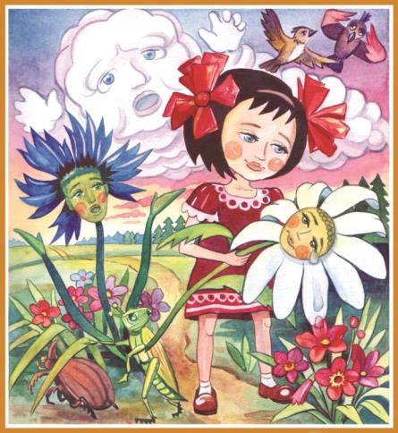 Увидев девочку, все обитатели лужайки заметались: стрекозы и бабочки стали улетать, кузнечики попрятались в траве, а цветочки стали прикрывать свои яркие лепестки…