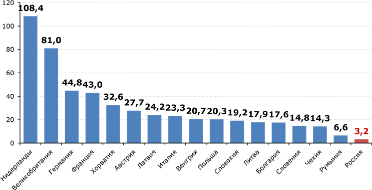 Рисунок 1. Сравнение показателя «Ипотека к ВВП» России и зарубежных стран в 2012 году, %