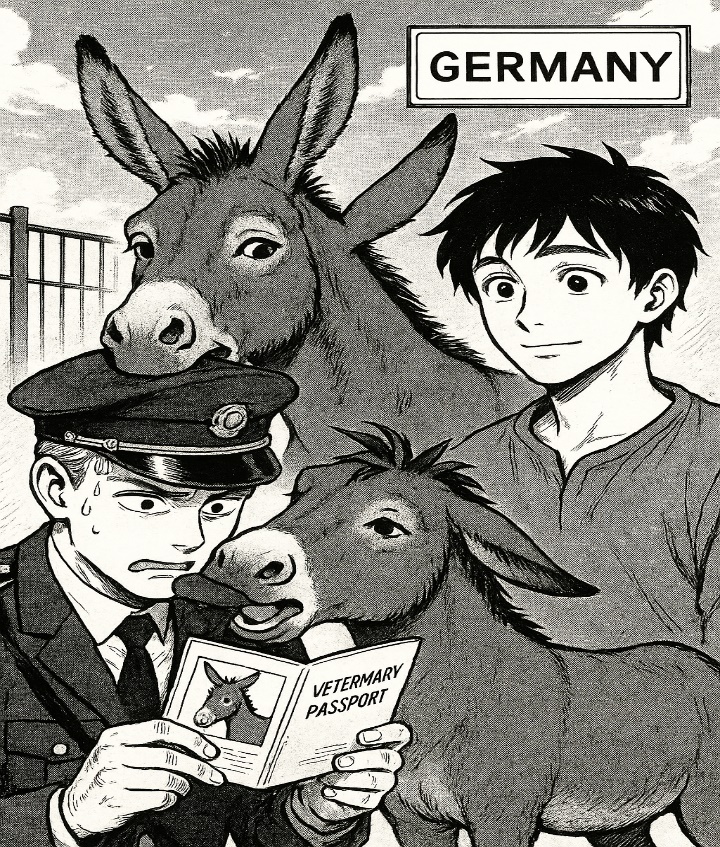 Осёл Ганс вызвал подозрение. Немецкий таможенник – блондин с глазами, как у енота в прожекторе – внимательно осмотрел документы.