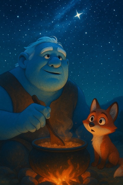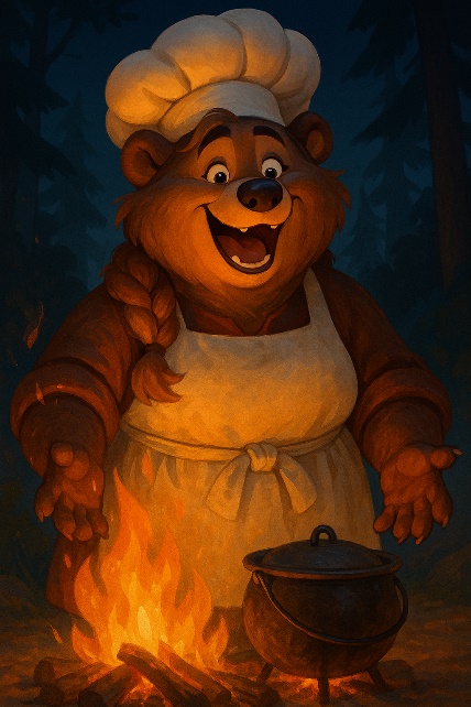И тут из темноты вышла широкоплечая, пушистая, но очень аккуратная повариха с пышным фартуком и весёлым голосом. Она поставила котелок над огнём и вдруг засмеялась: