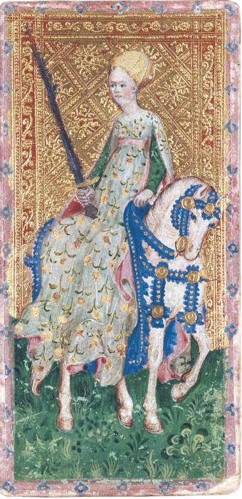Одна из вариаций карты «Дама мечей» из Таро Висконти – Сфорца. Библиотека редких книг и рукописей Бейнеке. Йельский университет. XV в.