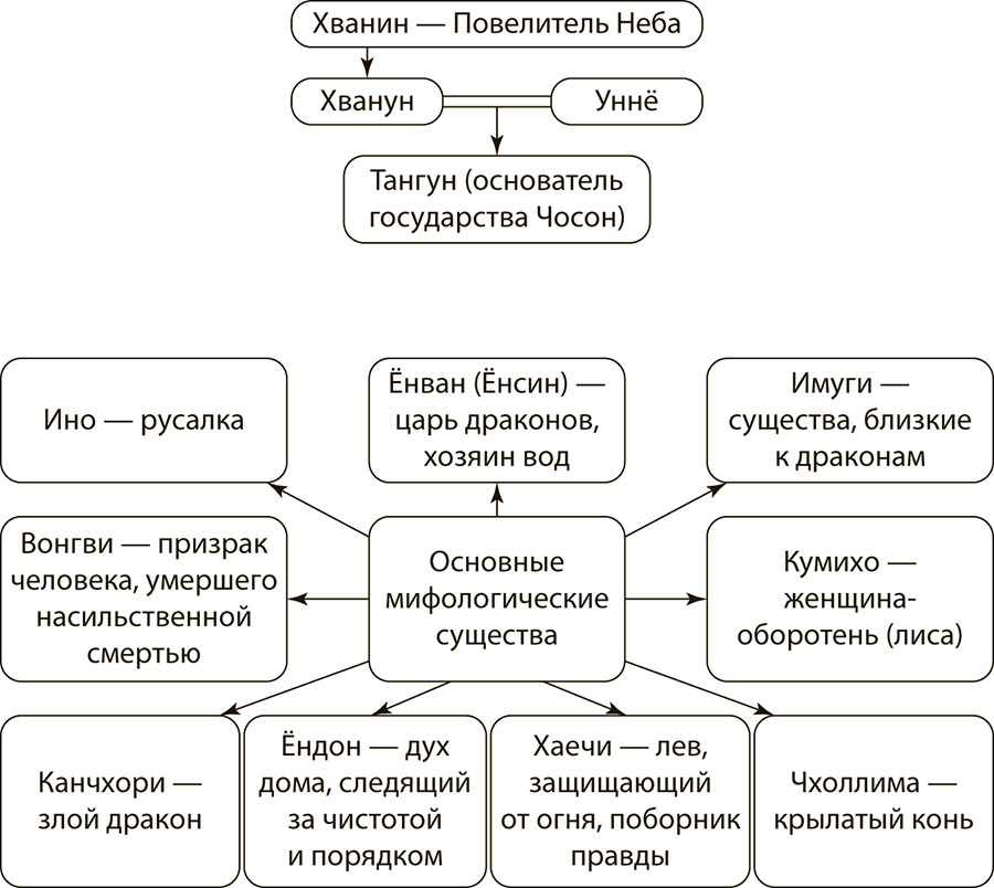 В некоторых преданиях местом рождения главного героя (героини) служит небо, вершина горы либо подземелье: возможно, это наследие древнейших мифов, повествовавших о рождении главных стихий, земли и неба. В целом же надо признать, что корейских мифов и преданий о богах до нас дошло относительно немного. Большинство сохранившихся в источниках историй повествуют о создании государства, о различных существах и духах, олицетворяющих те или иные явления, о происхождении правил социума. Значительную часть дошедших до нас мифов составляют не «общекорейские», а местные, связанные с какой-то небольшой территорией: так, например, практически в любом регионе Кореи вам расскажут историю о появлении той или иной горы, реки, долины или чего-то в этом роде. Ну а с конкретными сюжетами мы познакомимся уже в следующих главах!
