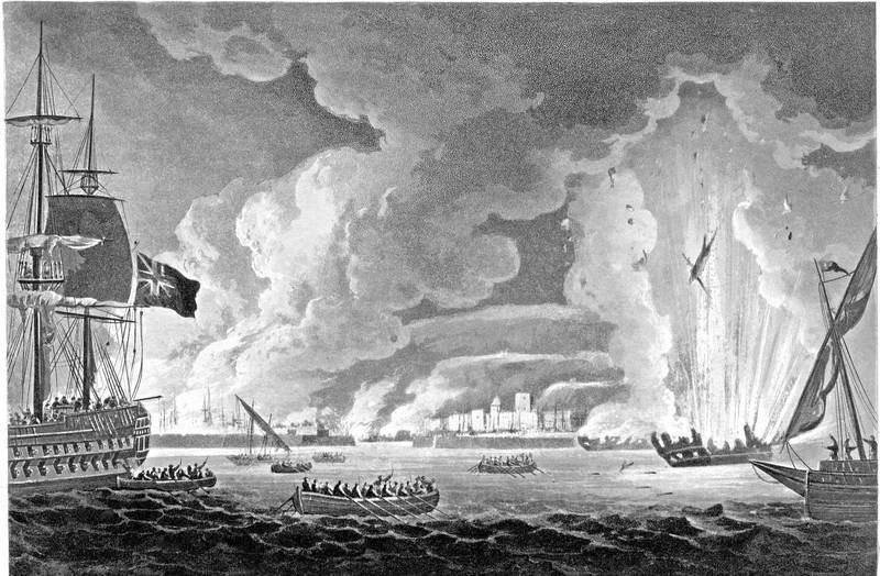 Французские корабли горят на рейде Тулона, 18 декабря 1793 г. Гравюра Т. Сазерленда с картины Т. Уайткомба, 1816 г.