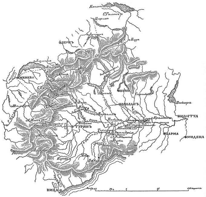 IСардинский король, прозванный по своему географическому и военному положению привратником Альп, имел в 1796 г. крепости у всех ведущих в Пьемонт перевалов. Чтобы проникнуть в Италию через Альпы, нужно было овладеть одной или несколькими из этих крепостей. Дороги не позволяли везти с собой осадную артиллерию. Горы покрыты снегом три четверти года, и осаде крепостей можно было уделить только очень короткое время. У Наполеона зародилась мысль обойти все Альпы и вступить в Италию через такое место, где эти высокие горы обрывались и где начинались Апеннины. Монблан является самой высокой точкой Альп, откуда цепь этих гор идет, понижаясь, к побережью Адриатического моря, а также к побережью Средиземного моря до горы Сан-Джиакомо, где они заканчиваются и где начинаются Апеннины, постепенно поднимающиеся к горе Велино у Рима. Гора Сан-Джиакомо, следовательно, является самой низкой точкой Альп и Апеннин – и тем местом, где оканчиваются одни и начинаются другие. Савона, морской порт и крепость, была расположена так удачно, что могла служить складочным местом и опорным пунктом для армии. От этого города до Мадоны 3 мили. Туда вело шоссе. От Мадоны до Каркаре 6 миль. Эту дорогу можно было сделать проходимой для артиллерии в несколько дней. В Каркаре имелись колесные дороги, ведущие вглубь Пьемонта и Монферрата. Это место было единственным, по которому можно было войти в Италию, не встречая гор. Повышение местности здесь настолько незначительное, что впоследствии, во времена империи, возник проект построить канал для соединения Адриатического моря со Средиземным по рекам По, Танаро, Бормида и по системе шлюзов от Бормиды до Савоны. Проникая в Италию через Савону, Кадибону, Каркаре и Бормиду, можно было рассчитывать отделить сардинскую армию от австрийской, потому что это создавало одинаковую угрозу Ломбардии и Пьемонту. Можно было двинуться как на Милан, так и на Турин. Пьемонтцам было выгоднее прикрывать Турин, австрийцам же – Милан.