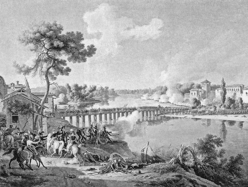 IVАрмия реквизировала в городе Пьяченце 400 артиллерийских лошадей. 10-го она выступила из Казаль-Пустер-ленго на Лоди, где Болье сосредоточил дивизии Себоттен-дорфа и Розельмини, а Колли и Вукассовича направил на Милан и Кассано. Судьба этих войск зависела теперь от быстроты движения. Можно было отрезать их от Олио и взять в плен, но в одном лье от Казаля французский авангард обнаружил сильный австрийский арьергард из гренадер, выгодно расположившийся для обороны лодийского шоссе. Пришлось прибегнуть к маневрированию. Оно велось со всем пылом и вместе с тем упорством, которых требовали обстоятельства. Наконец, в ряды противника было внесено смятение. Он был преследуем по пятам до Лоди. Эта крепость была обнесена стенами. Неприятель попытался запереть ворота, но французские солдаты проникли туда вперемежку с беглецами, которые собрались потом за линией обороны, созданной Болье на левом берегу Адды. Болье выставил 25–30 пушек для обороны моста, но французы немедленно противопоставили ему столько же.