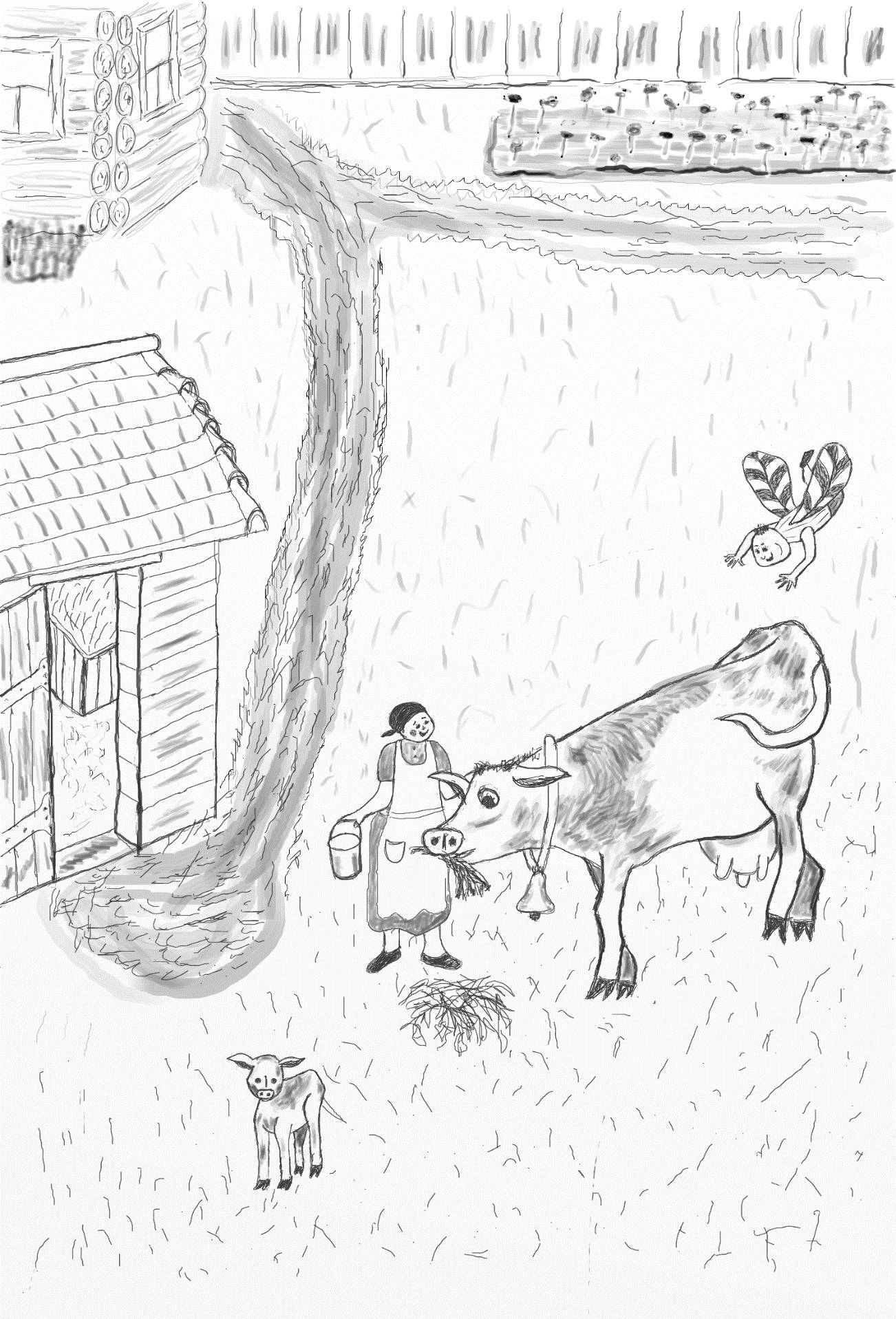Букася полетел над деревней, высматривая, кто бы мог помочь. И увидел тётю Машу, которая доила Буренку во дворе. Он затрепетал крыльями и опустился рядом с ними.