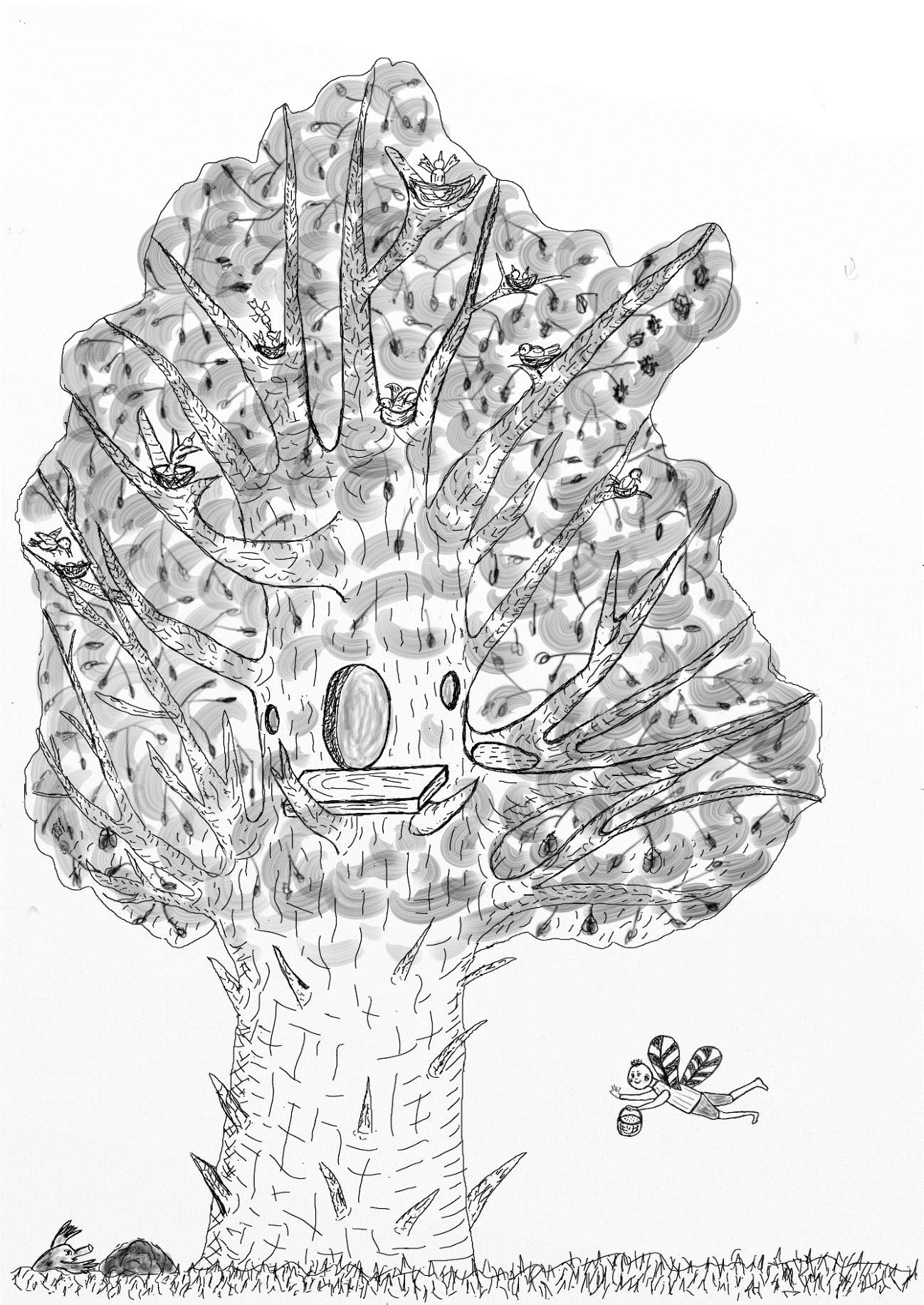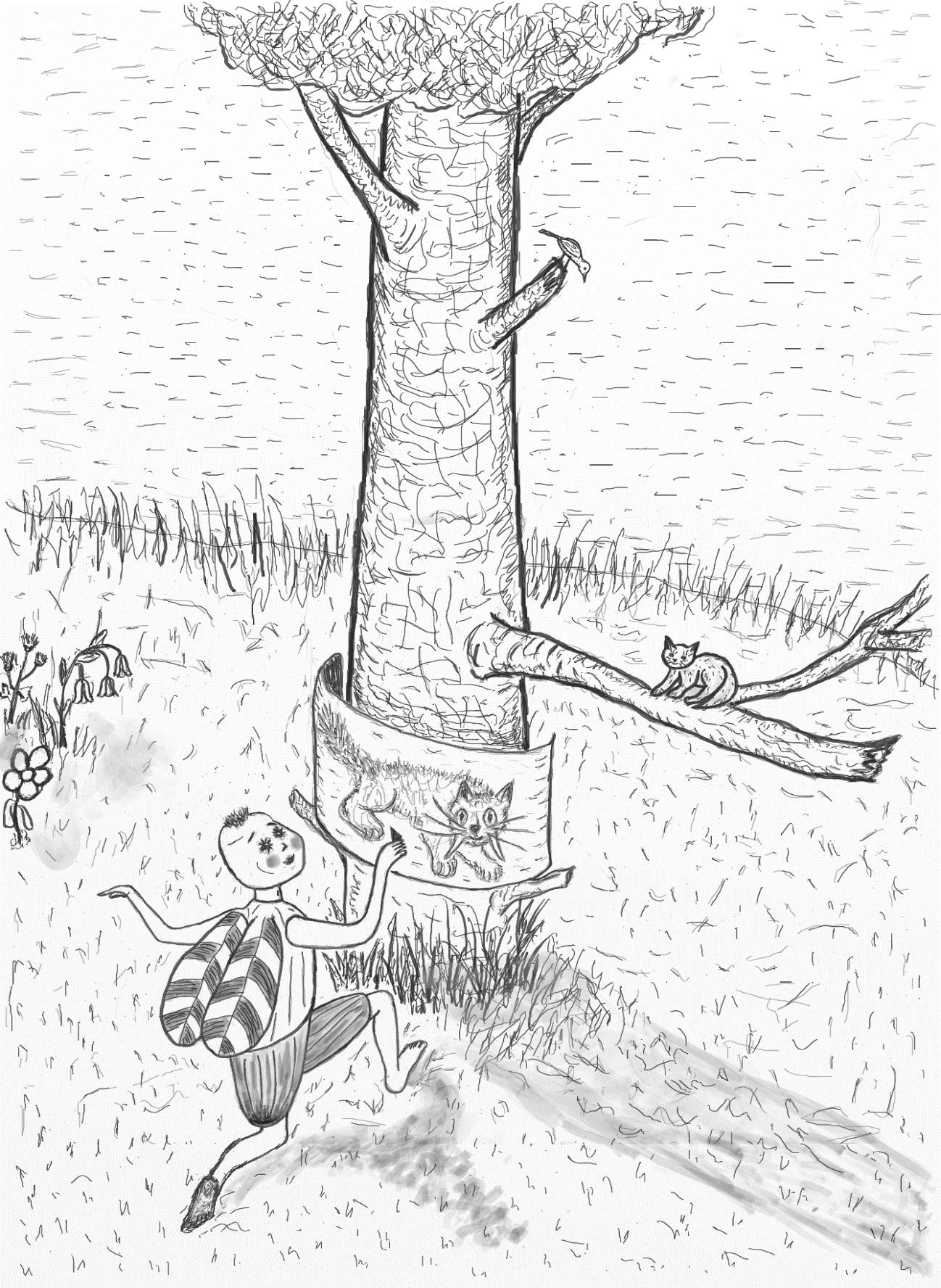 И друзья принялись за дело. Нашли в погасшем костре обугленную палочку, отодрали с берёзы бересту. Букася нарисовал на ней Касю с большими глазами, усищами и острыми клыками. А чтобы ещё и дух кошачий их отпугивал, Кася потёрся боками о картинку и даже лизнул своё изображение на бересте.