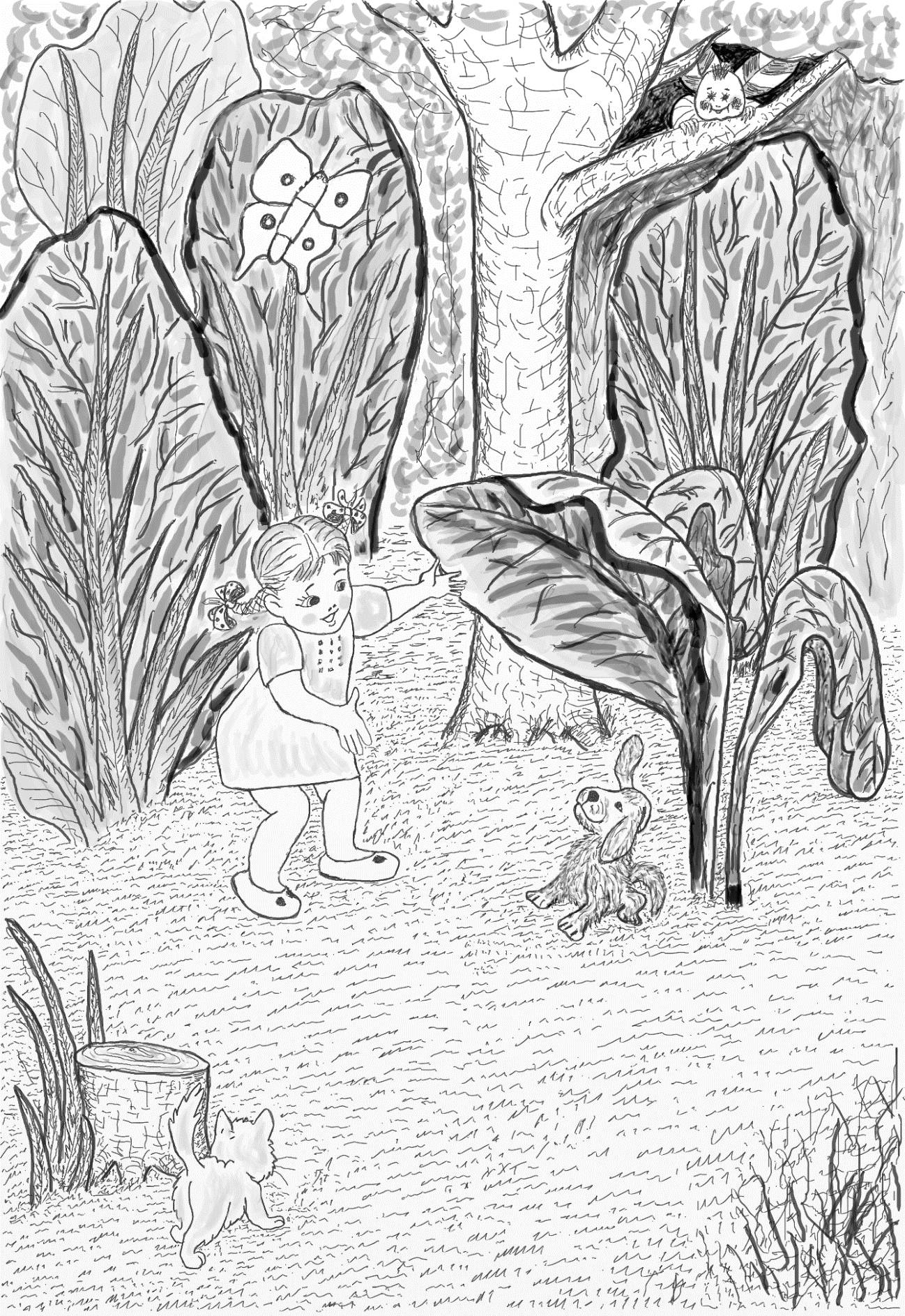 Букася, Светик и Кася играют в прятки на лесной лужайке недалеко от дома. У Каси слух острый, нюх чуткий. Он быстро находит того, кто спрятался. А Букася часто пользуется крыльями. То укроется в ветвях, то поднимется высоко и всё видит оттуда. Труднее всего Свете. Обогнать Касю и Букасю она не может, летать не умеет, и вынюхивать следы у неё тоже не получается. Поэтому ей чаще всего приходится водить, то есть разыскивать друзей. Вот и сейчас, смотрит она – большие лопухи растут. Наверно за ними кто-то спрятался. Отогнула лист, а под ним сидит щенок и хвостиком виляет, радуется, что его нашли.