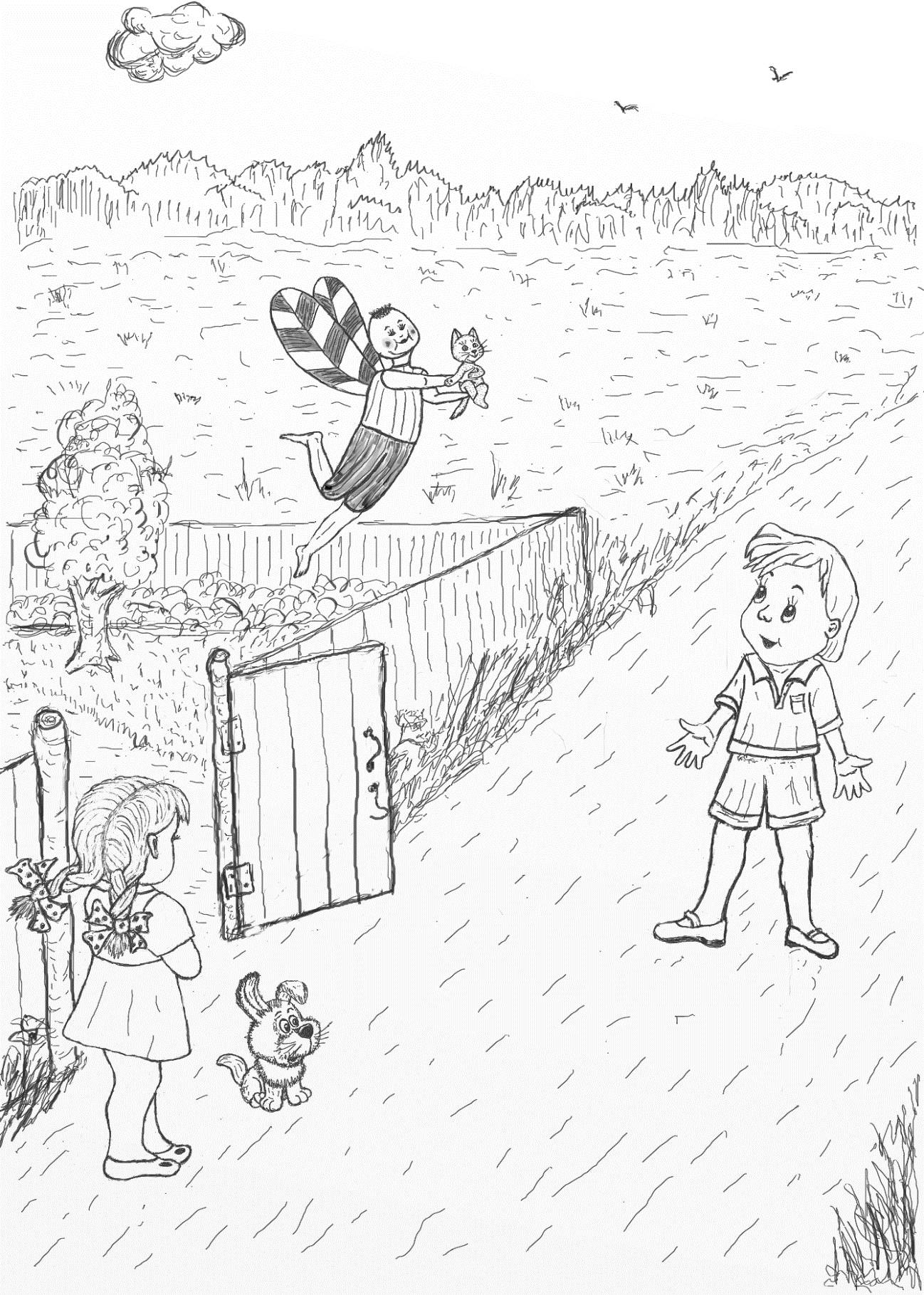 Букася поставил Касю, взял сзади девочку под мышки и стал медленно подниматься. Вот они взлетели выше сарая, выше дома и даже выше берёзы. А потом сделали круг и плавно опустились на землю. Светик не показывала виду, что ей было страшно.