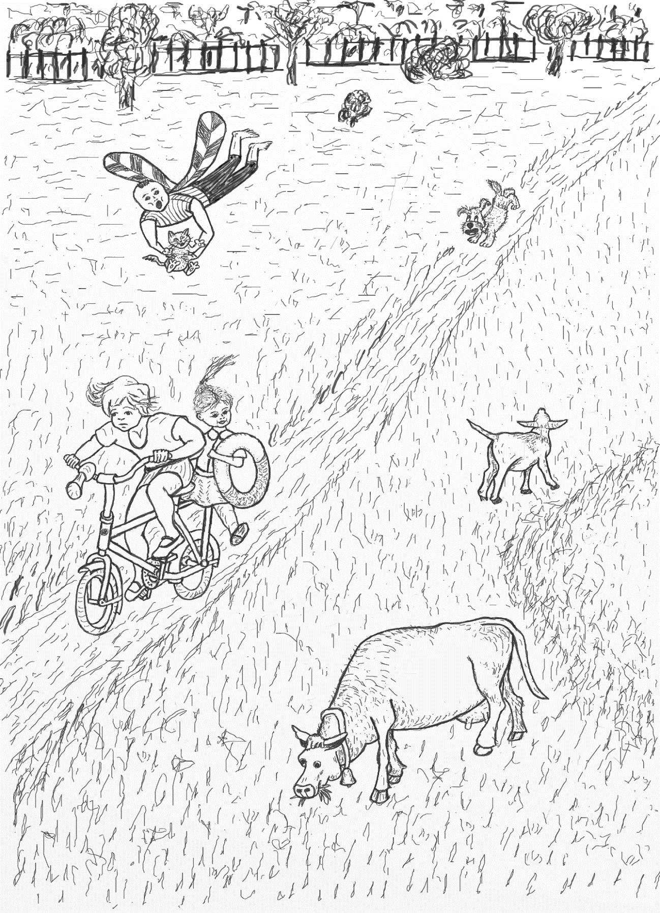 Вскоре к реке двигалась интересная компания. Вверху летел Букася с Касей на руках. По тропинке на велосипеде ехал Вова. Сзади него, на багажнике, сидела Светик и держала яркий надувной круг. А за ними нёсся Шарик. Увидев телёнка Муню, они закричали: