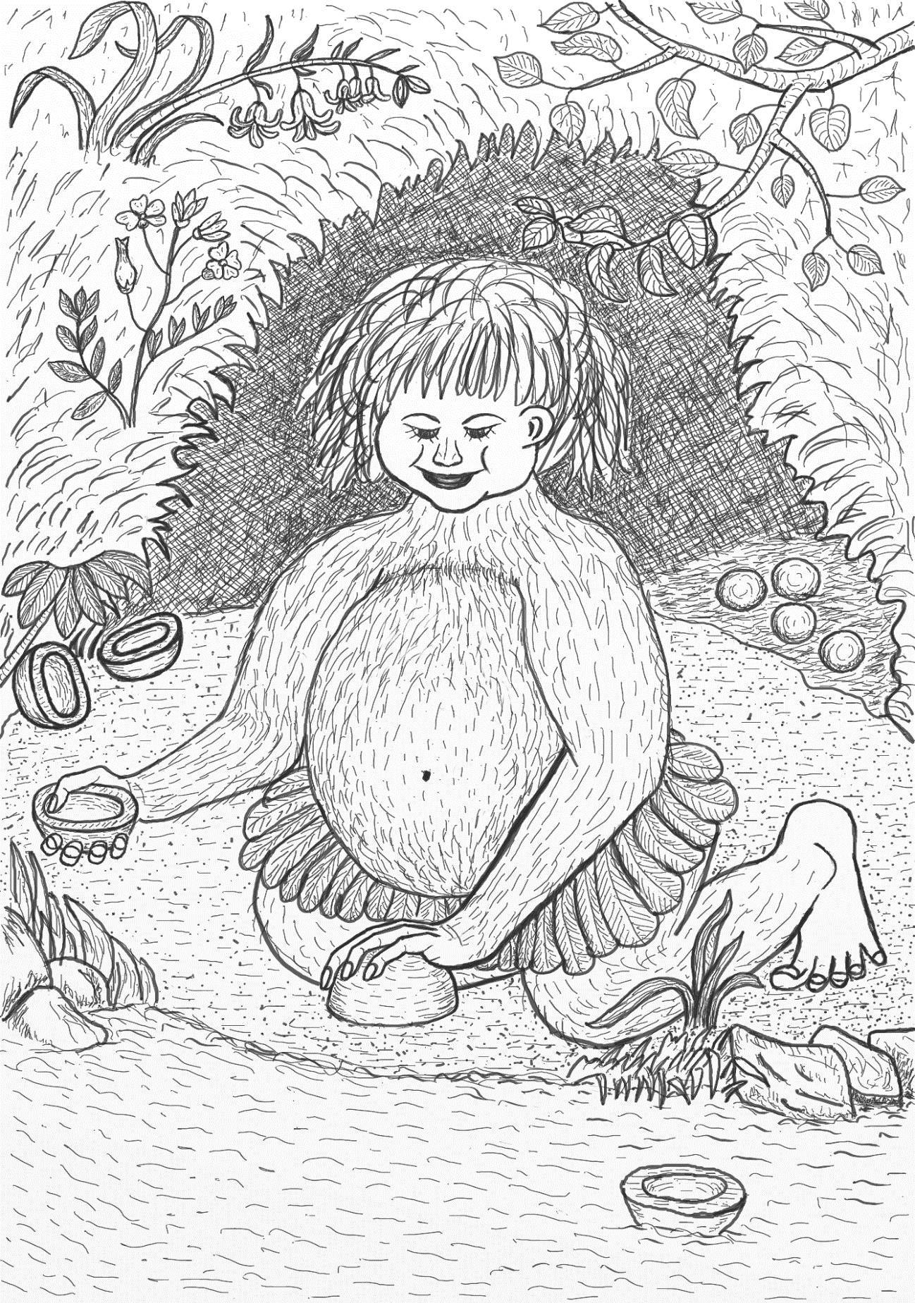 А к тыкве, дыне или арбузу они приходят большой гурьбой. Съедят всю сладкую мякоть, корке дадут подсушиться на солнышке и получается у них домик. Только надо окошки проделать, внутренность приспособить для житья и красоту навести. А вот кокос расколоть они не могут. Сил не хватает. Так вот эти кокосы они скатывают с горы прямо в пещеру великану. Захочет Барабан есть, берёт эти кокосы и щёлкает их, как семечки. А скорлупки пускает по горной реке, как лодочки. Это он так играет, чтобы не скучно было.