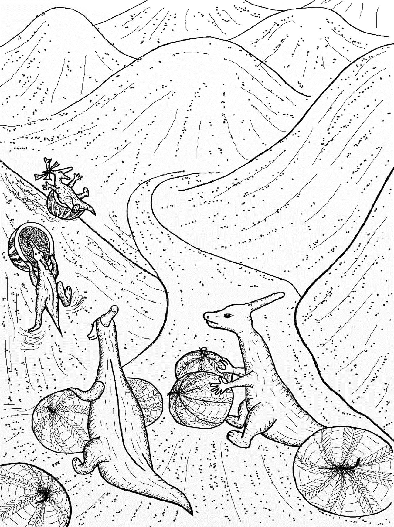 Назад к пещере катить тяжёлый арбуз пришлось Завру, а дети следили, чтобы из него не вывалилась пробка.