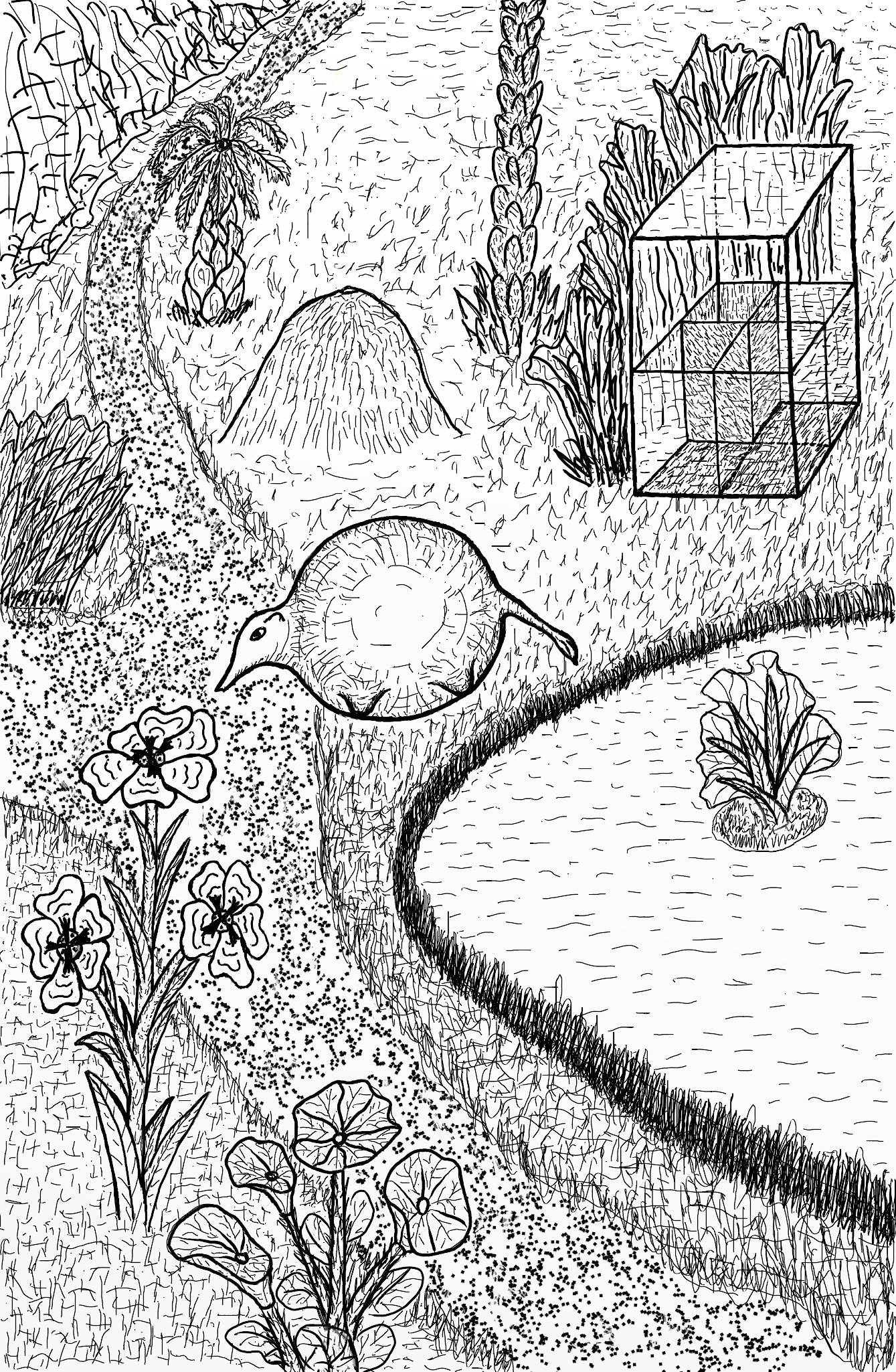На первой странице, сверху, надпись – «Нургуру», ниже – рисунок необычного животного, а ещё ниже – пояснение. Туловище и голова, как у ящерицы; нос, как у чайки; гребешок, как у попугая; задние лапы, как у вороны, передние – как у тушканчика; хвост, как у крысы; на животе сумка, как у кенгуру; сзади крылья, как у лебедя. Живут в норах, под деревьями. Питаются насекомыми.