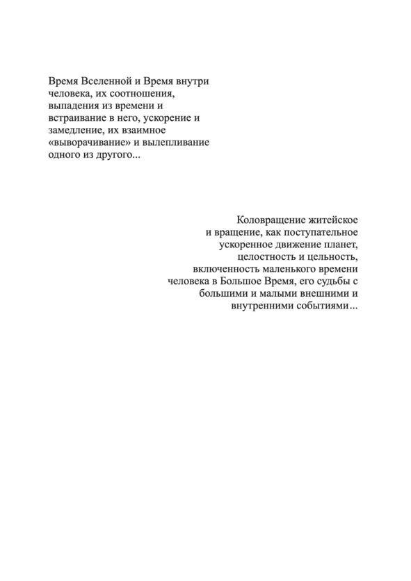 Прикоснуться к магии геометрии, взаимодействия чисел, – значит войти в поток пропорций, взаимодействий, сил, закономерностей, по которым движутся Солнца и Светила, и наши душевные силы, и жизненные соки самой Жизни, – по законам Времени. Время Вселенной и Время внутри человека, их соотношения, выпадения из времени и встраивание в него, ускорение и замедление, их взаимное «выворачивание» и вылепливание одного из другого…