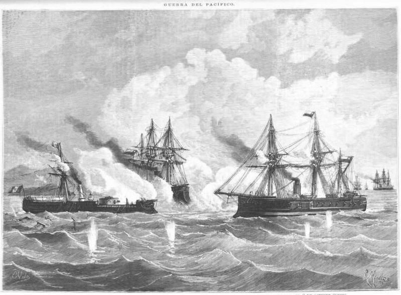«…перуанский броненосец «Уаскар», прославившийся два года назад стычкой с британской эскадрой, отличился вновь! Потопив в морском бою возле порта Икике чилийский корвет «Эсмеральда» (при этом героически погиб командир корвета, капитан Артуро Пратт), монитор продолжил крейсерство и уже на следующий день ворвался в гавань захваченного чилийцами боливийского порта Мехильонес, где устроил настоящий погром, потопив около десятка различных судов. После чего направился к порту Антофагаста, где чилийцы высаживали с транспортов подкрепления, и подверг порт бомбардировке, несмотря на ответный огонь береговых батарей и канонерской лодки. Перед тем, как вернуться в Кальяо, командир «Уаскара» адмирал Мигель Грау велел перерезать подводный телеграфный кабель, связывающий Антофагасту с Вальпараисо и Кальдерой, а на обратном пути перехватил и потопил несколько чилийских шхун с воинскими грузами…»