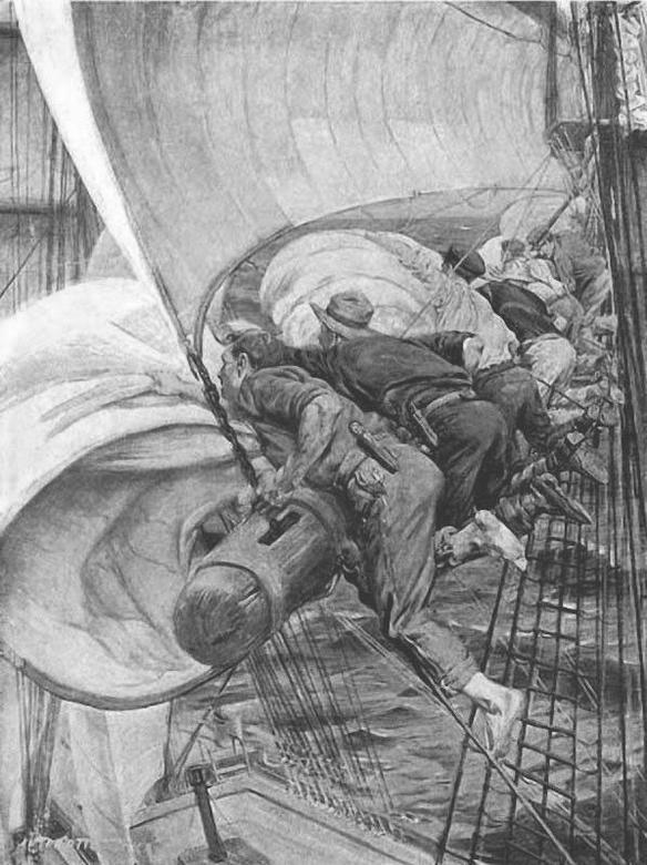 Нет уж, подумал он, взбегая наверх по узкому трапу, лучше писать о том, что он видел собственными глазами и знает доподлинно: о войне, кораблях, морской службе, о картинах быта и обыденной жизни моряков, столь любезные читателям «Нивы». Вот, к примеру: почему бы не описать в очередной главе дневника аврал, из-за которого надувают сейчас щёки усачи-боцмана, высвистывая команду – "все наверх, рифы брать!"