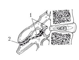 Рис. 21. Спондилоартроз (1) и межостистый неоартроз (2) при поясничном лордозе