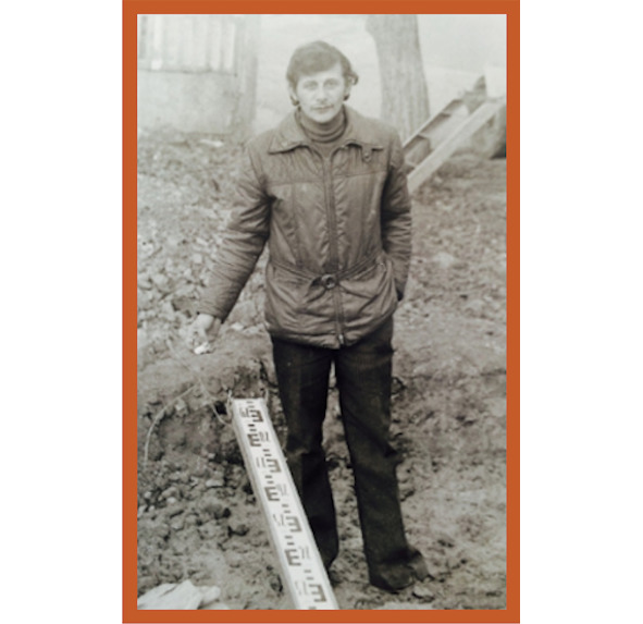 На геодезической практике. В руке кусочек мела, которым я рисовал высотные отметки.