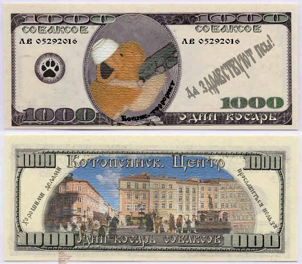 Думая, как назвать и вводить в наш город валюту, мы решили именовать деньги кэтами (от услышанного в Америке «cat», что означает «кот»), напечатать их определённое количество и выдать мэрии, которая бы распространила кэты по нужным заведениям, откуда бы их в качестве зарплаты получали горожане. Деньги должны были раздавать предприятиям по мере необходимости, все же незадействованные купюры хранились бы в городской казне. А чтобы ни мэрия, ни кто другой не прибрал «ненужные» кэты к лапам, городской совет решил, чтобы все горожане могли свободно следить как за работой правительства, так и за получаемыми и отправляемыми отчётами. Идея появления валюты была принята горожанами, в особенности ликовал Бобик-затулянт, запарившийся крутить свой бизнес на одном лишь обмене, вскоре планы были приведены в действие, и вот уж в городе заработала удобная финансовая система. Даже выдавать дополнительные деньги не потребовалось: кэты стали просто переходить от предприятий горожанам и от горожан другим предприятиям, как и планировалось.