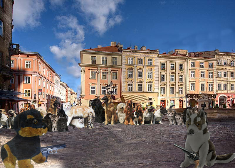 Враз вдруг послышался пронзительный двухголосый мяв Мяучера и Грозы Крыс, а через пару секунд пред собачьими глазами предстали и они сами. Ох, как перепугались собаки, увидев кота с неестественным фиолетовым цветом шерсти, ещё и дико орущего! Даже стрелять перестали, если не повыроняли из лап «стволы»! Воспользовавшись замешательством и не давая псам прийти в себя, я велел основному отряду максимально приблизиться к противнику и окружить его. Собаки даже не попытались нам помешать, а когда более-менее пришли в себя, то уже оказались в западне. Поняв безвыходность ситуации и всё ещё косясь на сотворившего столь незабываемый эффект Мяучера, псины побросали оружие. Через некоторое время вновь появился Злючка, видимо, понявший, что что-то пошло не так, и увидев, что его соратники окружены, тоже бросил пушку и подошёл к нам.