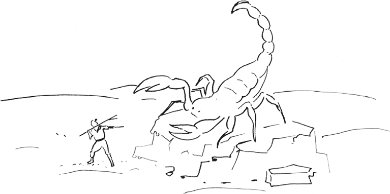 Аристотель (ШМ в. до н.э.)Как я уже рассказывал, служба в армии, в мирное время, довольно однообразна и скучна. А когда это длится три года, то можете себе представить. Только по воскресениям нас водили, опять-таки строем, под песню в дом культуры, в кино. А так каждый старался в свободное от службы время, чем-нибудь себя занять: большинство – спортом, подготовкой к институту и так далее. Так уж получилось, что у «салаг» времени не было практически, у «молодых» время уже появлялось, а у «стариков» было больше всего. Но не из-за какой-то дискриминации, а потому что «старик» благодаря своему опыту выполнял свою работу и все свои дела по службе за час, а «салага» за день. Случилось то, о чем я хочу рассказать, в конце второго года службы. Я был еще не «старик», но уже почти не «молодой». У нас был в гарнизоне медблок и возглавлял его подполковник Писарчук. О нем я уже рассказывал. Кто-то из ребят мне рассказал, что он собирает крупных скорпионов, фаланг и каракуртов. Причем, за скорпионов и фаланг размеров больше 5 см. дает отдохнуть в медсанчасти три дня, а за любого каракурта семь дней. Для каких целей он их собирает, никто не знает, да и не наше это дело, а вот отдохнуть в санбате от службы, да и поесть по другой норме питания хотелось бы. Однажды во время службы я его встретил и спросил об этом. Он мне все подтвердил и сказал, что если я принесу насекомое, то все так и будет. Только без болтовни.