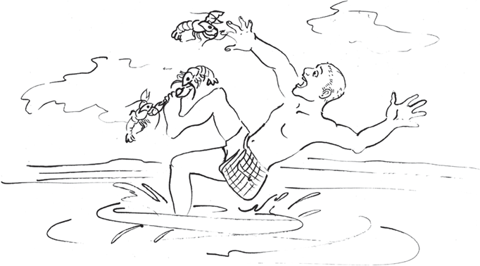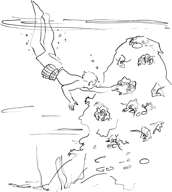 Зашли в воду. Теплая. Мелкие волны набегали на нас чуть чуть охлаждая разгоряченные тела. Дробленые морским прибоем ракушки, от потоков набегающих волн, струились под ступнями и щекотали их. Старшина, отплыл от берега на десять – пятнадцать метров и позвал нас к себе. Подплыли. Он знаком показал нырнуть в воду. Я увидел, как он сунул палец в норку к раку и тут же вытащил его. На пальце висел зацепившись клешней небольшой рак. Он его стряхнул прямо под водой в клеенчатую сумку висевшую у него на поясе. Все это мы увидели под водой. Видно было не очень хорошо. Мы были без масок. Но солнце светило ярко и все освещало.