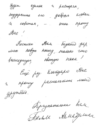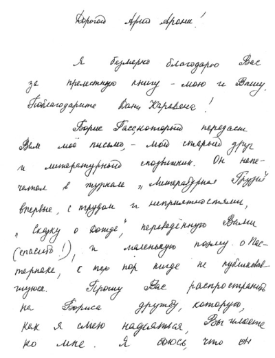 Я безмерно благодарю Вас за прелестную книгу – мою и Вашу. Поблагодарите Дани Каравана за оформление. Борис Гасс, который передаст Вам это письмо, – мой старый друг и литературный сподвижник. Он напечатал в журнале «Литературная Грузия» впервые, и с трудом и неприятностями, «Сказку о Дожде», переведенную Вами (спасибо!), и маленькую поэму о Пастернаке, с тех пор нигде не публиковавшуюся. Прошу вас распространить на Бориса дружбу, которую, как я смею надеяться, Вы имеете ко мне. Я боюсь, что он будет одинок и растерян, – поддержите его добрым словом и советом, – очень прошу Вас.