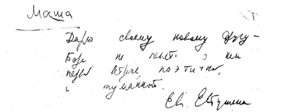Мы поймали такси. Женя сел впереди, я – на заднее сидение. Стекло машины запотело, и Женя всю дорогу выводил по нему пальцем и стирал: Евг. Евтушенко… Евг. Евтушенко…