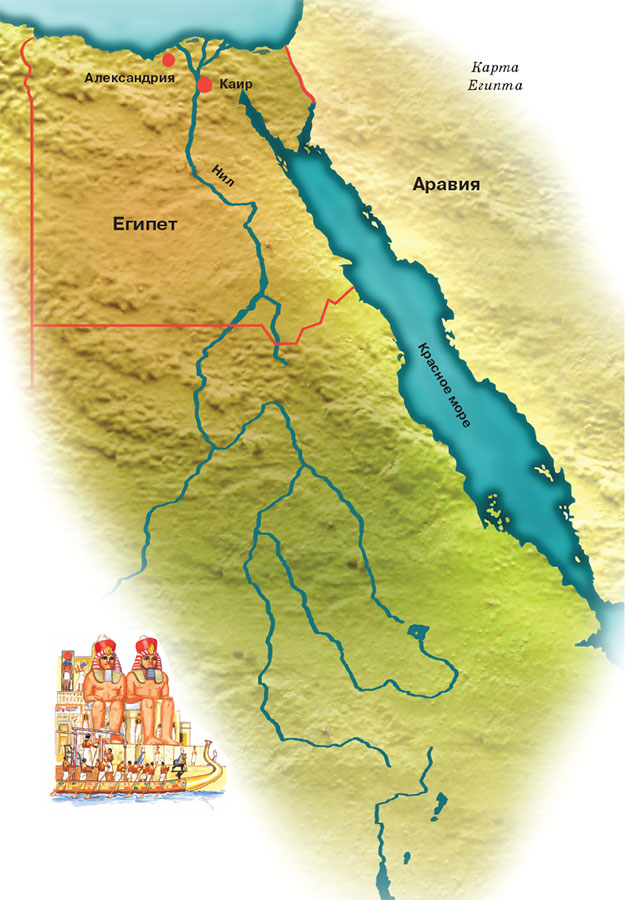 Как в доисторические времена, так и сейчас почти все население Египта обитает по берегам Нила, главной транспортной артерии страны. Одна из величайших рек мира Нил вытекает из больших африканских озер, расположенных у экватора, проходит пять порогов и затем плавно течет на протяжении 700 километров в глубокой долине, окаймленной высокими каменистыми обрывами. Ширина этой долины колеблется от 12 до 15 километров.