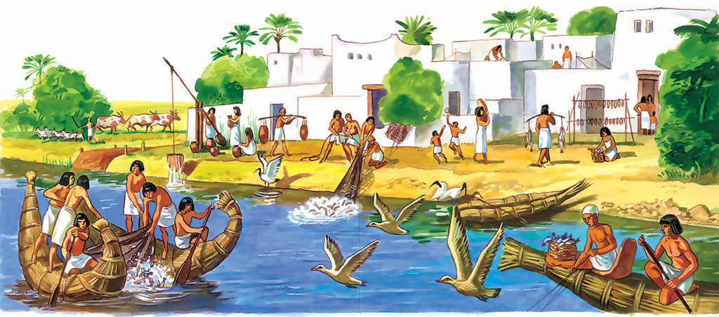 Дождей в Египте почти не бывает. Плодородие нильской долины обеспечивается сезонными разливами реки, которые вызываются таянием снегов и обильными дождями в центральной Африке. В летние месяцы вода в Ниле быстро прибывает, река выходит из берегов и затопляет значительные участки долины. Осенью вода спадает, и река входит в свои берега. После разлива почва в долине остается влажной и покрытой слоем плодородного ила. С древнейших времен египетские земледельцы получали высокие урожаи. Египтяне выращивали пшеницу, ячмень, технические культуры, разбивали сады. Значительная часть населения была занята также скотоводством. К IV тысячелетию до нашей эры в Египте сложилось относительно развитое хозяйство.