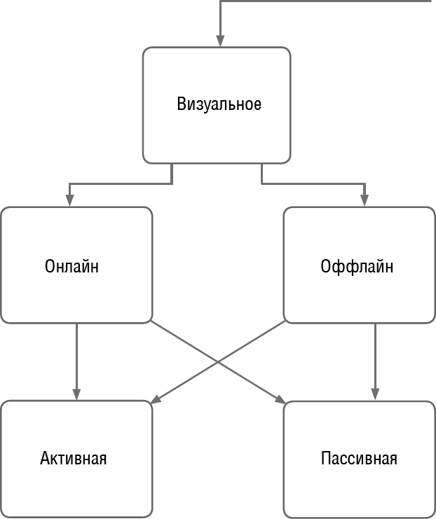 Если вы продаете парфюмерию и можете распространять приятные ароматы в помещении, где вас сложно обнаружить из-за засилья других предприятий малого (и не очень) бизнеса, то люди, почувствовавшие приятный запах, начнут вас искать глазами (и, скорее всего, найдут). Использование гравировки на ручках сидений в общественном транспорте выглядит как что-то запредельное, но если ваша аудитория – слепые люди (и такое наверняка бывает), то гравировка рекламного сообщения шрифтом Брайля может быть неплохим решением. Ремарка: в дальнейшей классификации в списке методов будут встречаться пометки «метод поддержки» или «под.». Это относится по большей части к способам продвижения, рассматриваемым в виде субкатегорий или подготовительных этапов к осуществлению другого воздействия на потенциального клиента через какой-либо орган чувств (чаще всего, конечно же, его глаза). С одной стороны, им место на уровень ниже, с другой – я не хотел их игнорировать или усложнять иерархию, поэтому добавил в список с пометкой «метод поддержки».