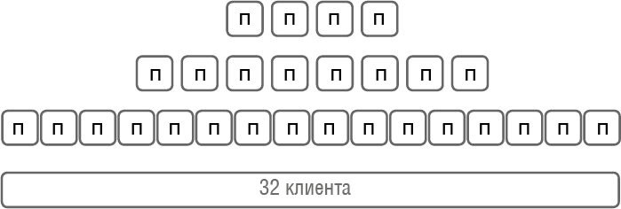 Например, вот идеализированная ситуация с коэффициентом виральности 2 при отсутствии активной рекламы, где потребность в услуге возникает каждый день, а каждый последующий уровень – новый день: